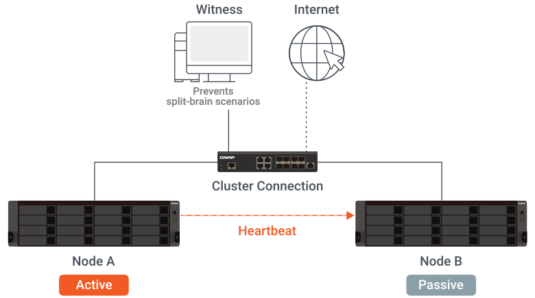 Crie um cluster de alta disponibilidade com dois TS-h2477AXU-RP — um como servidor ativo e o outro como servidor passivo. Caso ocorra uma falha ou problema inesperado com o servidor ativo, o servidor passivo fornecerá proteção imediata com failover automático. Isso garante a continuidade do serviço de armazenamento e a disponibilidade do sistema.